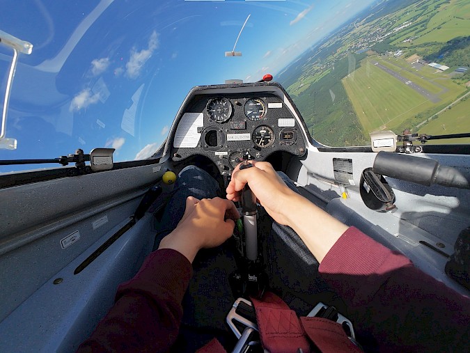 Nun entscheidet das Finden von Thermik, ob der Flug zu einer kurzen Platzrunde oder einem Stundenflug wird. Tatsächlich hatte der Wetterbericht recht und mit der fliegerischen Erfahrung von Wolfgang finden wir unverzüglich Thermik und so dauert mein erster Flug gleich länger als eine Stunde. Genug Zeit also, um selber das Flugzeug kennenzulernen, etwas zu steuern sowie einige Manöver zu erleben.