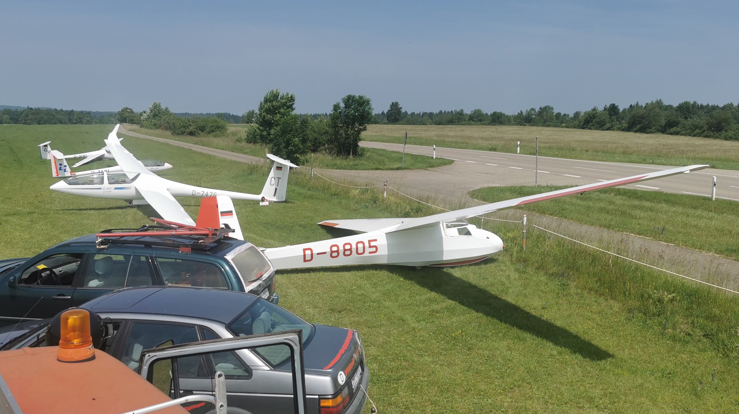 In der Zwischenzeit wurde die Startwinde auf die andere Seite des Flugplatzes gefahren und es gesellten sich am Start auch noch weitere Vereine hinzu, sodass der Blick zum Start in einem Meer aus Flugzeugen endete –kein Verein wollte sich das hervorragende Flugwetter entgehen lassen.